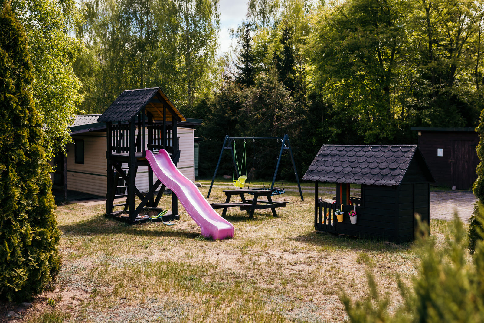 Dzieci mogą korzystać z placu zabaw, który zapewni im bezpieczną i radosną zabawę na świeżym powietrzu.